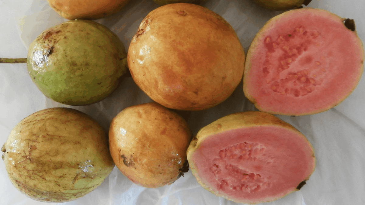 Guava: Another common tropical fruit, guava has a lemon looking rind, but with a sweet and juicy taste.