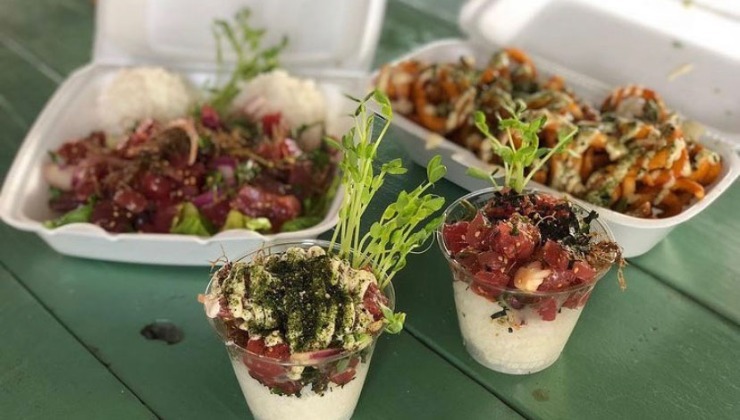 This little food truck is usually parked just past the Costco. There are outdoor picnic tables with shade, so it’s a great place to stop and enjoy some poke. Plates come with rice and greens, and there’s also katsu: fish rolled in panko, deep-fried and served with a special sauce.